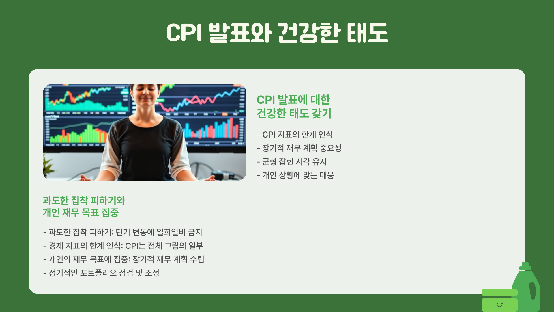 미국 CPI 발표로 인한 스트레스를 줄이기 위해서는 몇 가지 준비가 필요합니다. 첫째, 기본적인 경제 지표에 대한 이해를 높여야 합니다. CPI 외에도 PPI, 실업률, GDP 등의 지표를 함께 살펴보면 전체적인 경제 상황을 보다 잘 이해할 수 있습니다. 둘째, 발표 전후의 시장 반응을 예측하고 이를 바탕으로 투자 전략을 세우는 것이 중요합니다. 셋째, 심리적 안정성을 유지하기 위해 명상이나 운동과 같은 방법을 활용할 수 있습니다.