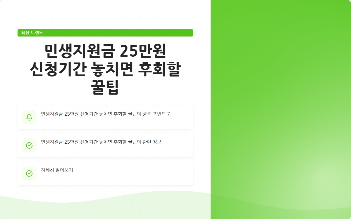 민생지원금 25만원 신청기간은 2025년 7월 중순부터 시작됩니다. 신청을 놓치면 후회할 수 있으니 잘 준비하세요! 필요한 정보는 정부 웹사이트에서 확인하고, 다양한 신청 방법을 미리 숙지하는 것이 중요합니다. 지금 바로 체크하세요!
