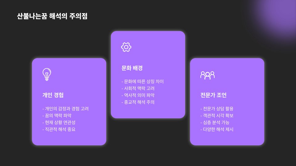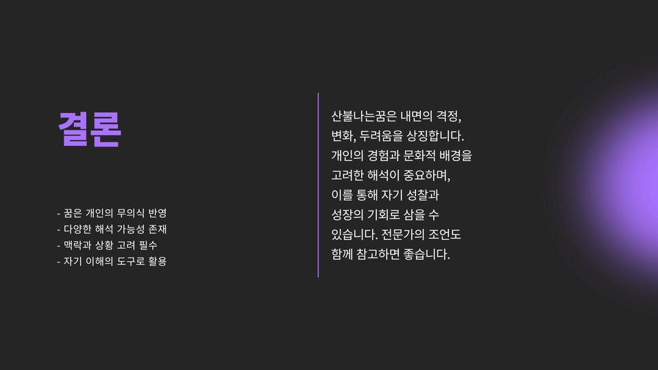 산불나는꿈은 여러 가지 개인적, 심리적 요소를 반영하는 복잡한 꿈입니다. 이 꿈을 통해 우리는 자신의 내면을 탐색하고, 감정을 이해하며, 필요한 변화를 모색할 수 있는 기회를 갖게 됩니다. 산불나는꿈의 의미를 이해하고, 그 해결책을 찾기 위한 과정을 통해 우리는 더 나은 방향으로 나아갈 수 있습니다. 결국 우리의 꿈은 우리가 진정으로 해결해야 할 문제를 직시하도록 도와주는 안내자 역할을 합니다.