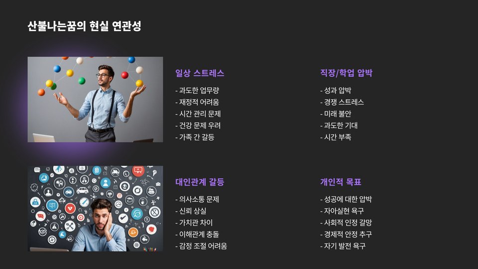 산불나는꿈은 여러 사람의 삶에서 다양한 방식으로 나타납니다. 예를 들어, 직장에서의 압박감이나 가정에서의 갈등이 꿈으로 나타날 수 있습니다. 이런 경우, 상담이나 멘탈 관리 방법을 고려하는 것이 좋습니다. 이를 통해 자신을 돌아보고 문제를 해결할 수 있는 기회를 가질 수 있습니다.
