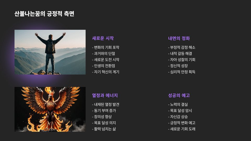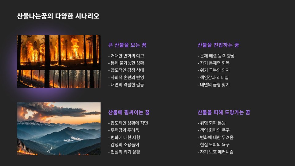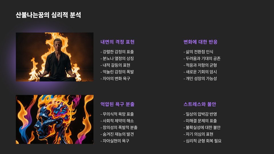 Tags: 산불나는꿈, 꿈 해석, 심리적 의미, 감정 분석, 스트레스 관리, 자기 성찰, 꿈의 상징, 일기 쓰기, 심리 상담, 불안감