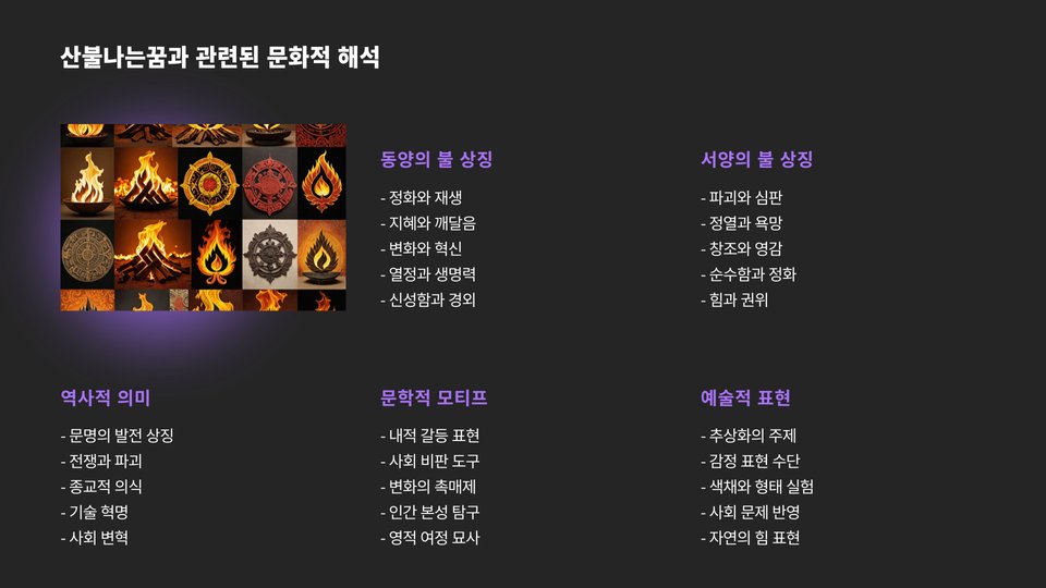Tags: 산불나는꿈, 꿈 해석, 심리적 의미, 감정 분석, 스트레스 관리, 자기 성찰, 꿈의 상징, 일기 쓰기, 심리 상담, 불안감