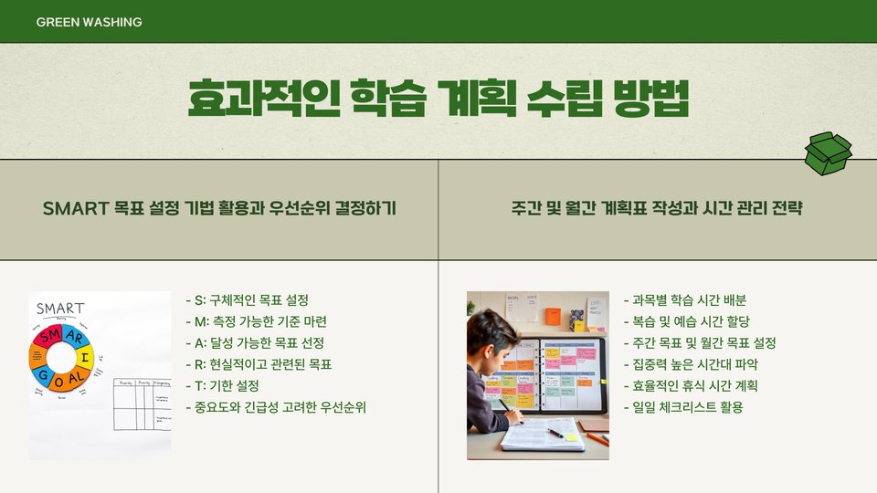목표를 설정한 후에는 이를 실현하기 위한 계획을 세워야 합니다. 예를 들어, 매주 공부할 과목과 시간을 정리해 스케줄을 짜는 것이 좋습니다. 이러한 계획은 목표를 달성하는 데 큰 도움이 됩니다. 또한, 목표는 주기적으로 점검하고 조정해 나가야 지속 가능성을 높일 수 있습니다.