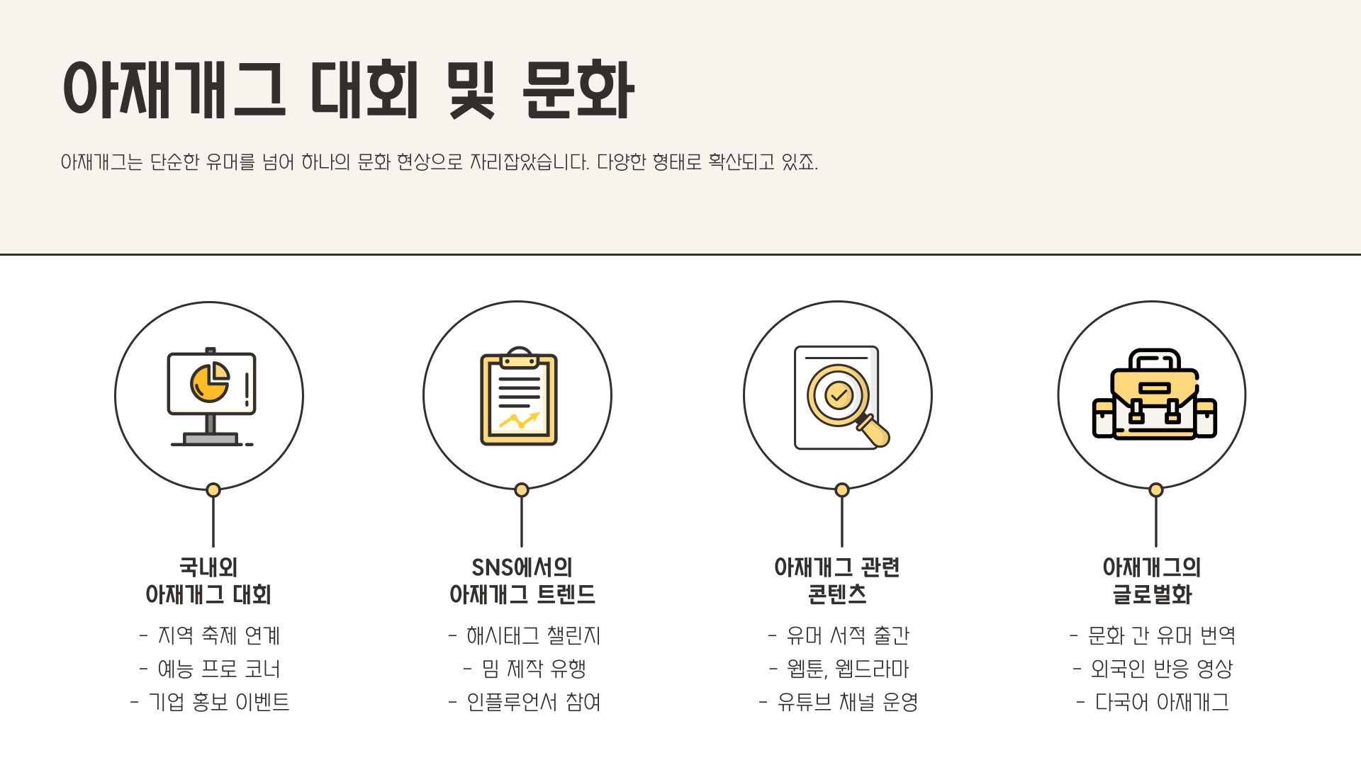 - 아재개그는 단순하고 허술한 유머로, 모두가 즐길 수 있는 특성이 있음