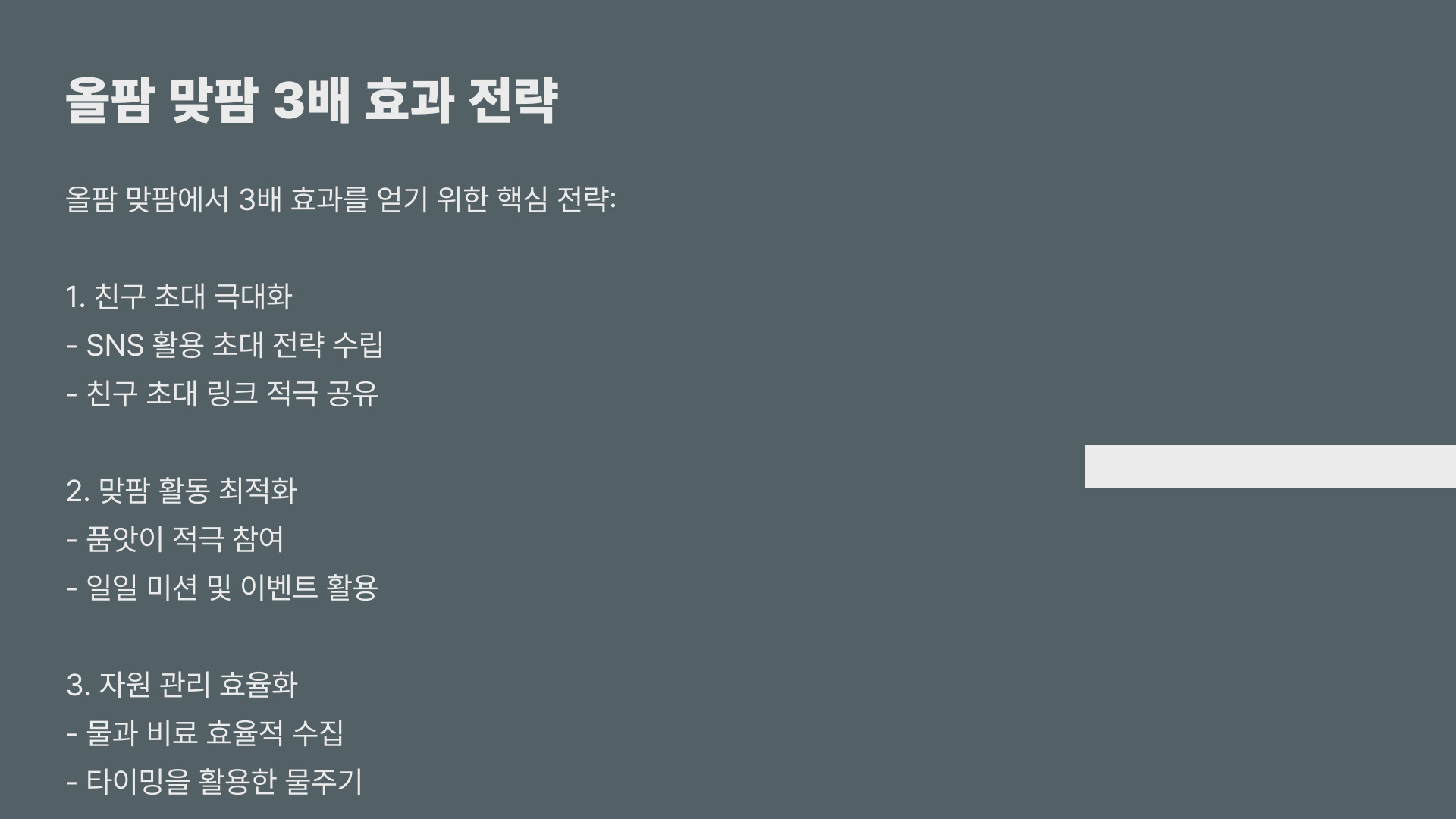 올팜 맞팜에서 친구를 초대하는 것은 게임을 즐기는 데 큰 도움이 됩니다. 친구 초대를 통해 얻는 다양한 보상은 게임 진행을 더욱 원활하게 만들고, 함께하는 즐거움을 더해줍니다. 위에서 소개한 방법과 전략을 잘 활용하여 친구를 초대하고, 3배 효과를 누리세요! 올팜 맞팜을 더 재미있게 즐기는 방법은 친구와 함께하는 것입니다.