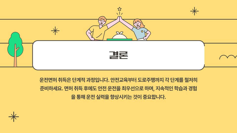 운전면허 취득은 단순한 자격증을 넘어서, 안전한 사회를 위한 중요한 과정입니다. 이 글에서 소개한 단계별 가이드를 통해 체계적으로 준비하고, 시험을 통과하여 안전한 운전자가 되길 바랍니다. 운전면허를 취득한 후에는 그 책임을 잊지 않고, 항상 안전을 최우선으로 생각하는 운전을 하시길 바랍니다.