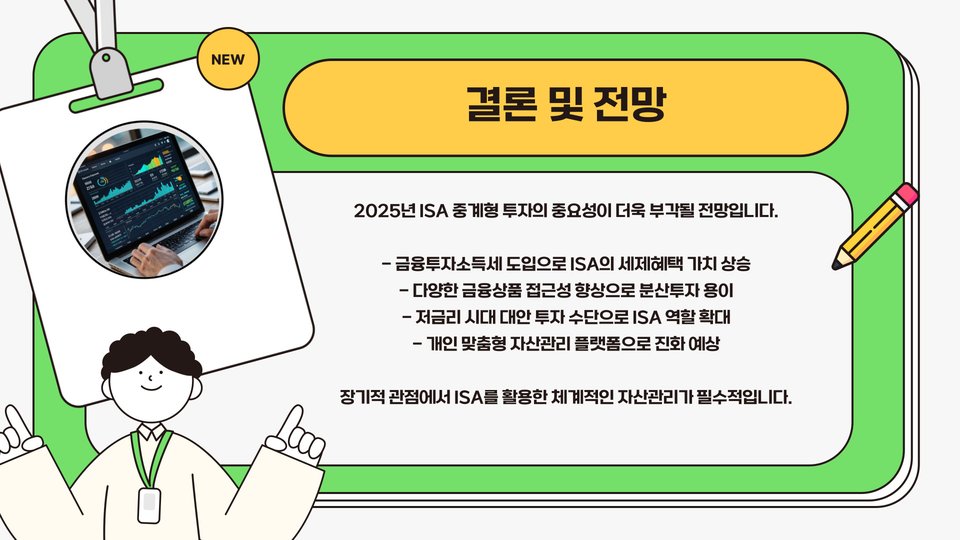 ISA 중계형 소액 투자는 누구에게나 적합한 투자 방법입니다. 특히 2025년을 앞두고 재무 관리와 투자 전략의 새로운 패러다임을 찾고 있는 많은 이들에게 적합한 선택이 될 것입니다. 그러나 어떤 투자든 리스크가 따르기 마련이므로, 자신의 투자 성향과 목표를 명확히 설정하는 것이 중요합니다.