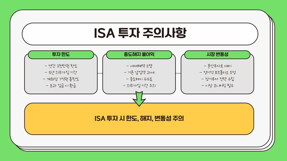 ISA 중계형 소액 상품에 투자할 때는 몇 가지 유의사항이 있습니다. 첫째로, 투자 목표를 명확히 설정해야 합니다. 각 상품마다 특징이 다르기 때문에, 자신의 투자 성향과 목표에 맞는 상품을 선택하는 것이 중요합니다.