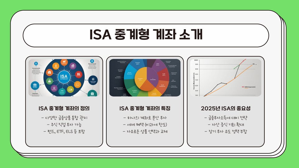 2025년이 코앞으로 다가오면서, 많은 사람들이 ISA 중계형 소액 투자의 중요성을 더욱 실감하고 있습니다. ISA(Individual Savings Account)는 개인 저축 계좌로, 실질적으로 세금 혜택을 제공하는 계좌입니다. 특히 소액 투자자들에게는 이 계좌를 통해 절세 효과를 극대화할 수 있는 기회를 제공하고 있습니다. 따라서 이번 블로그 포스트에서는 2025년을 겨냥한 ISA 중계형 소액 투자의 특징과 주요 추천 옵션에 대해 자세히 알아보도록 하겠습니다.