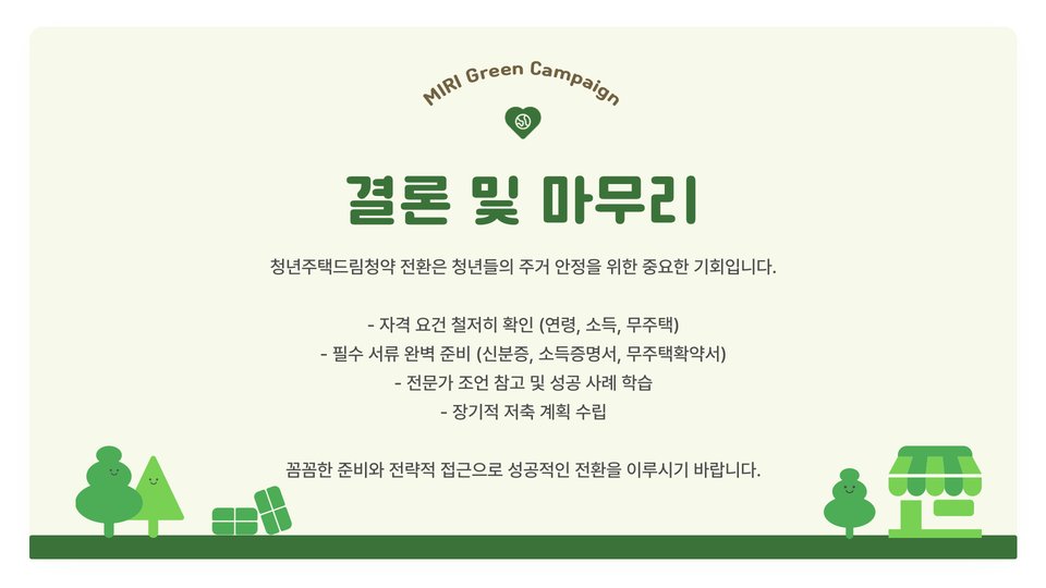 2025년의 청년주택드림청약은 청년층에게 매우 유용한 기회를 제공합니다. 이 과정을 통해 많은 청년들이 보다 나은 주거 환경을 마련할 수 있기를 바랍니다. 청년층의 주거 문제 해결은 단순한 개인의 문제가 아닌, 사회의 주거 복지 문제로 이어지는 만큼, 이러한 정책이 지속적으로 발전하고 개선되기를 바랍니다.