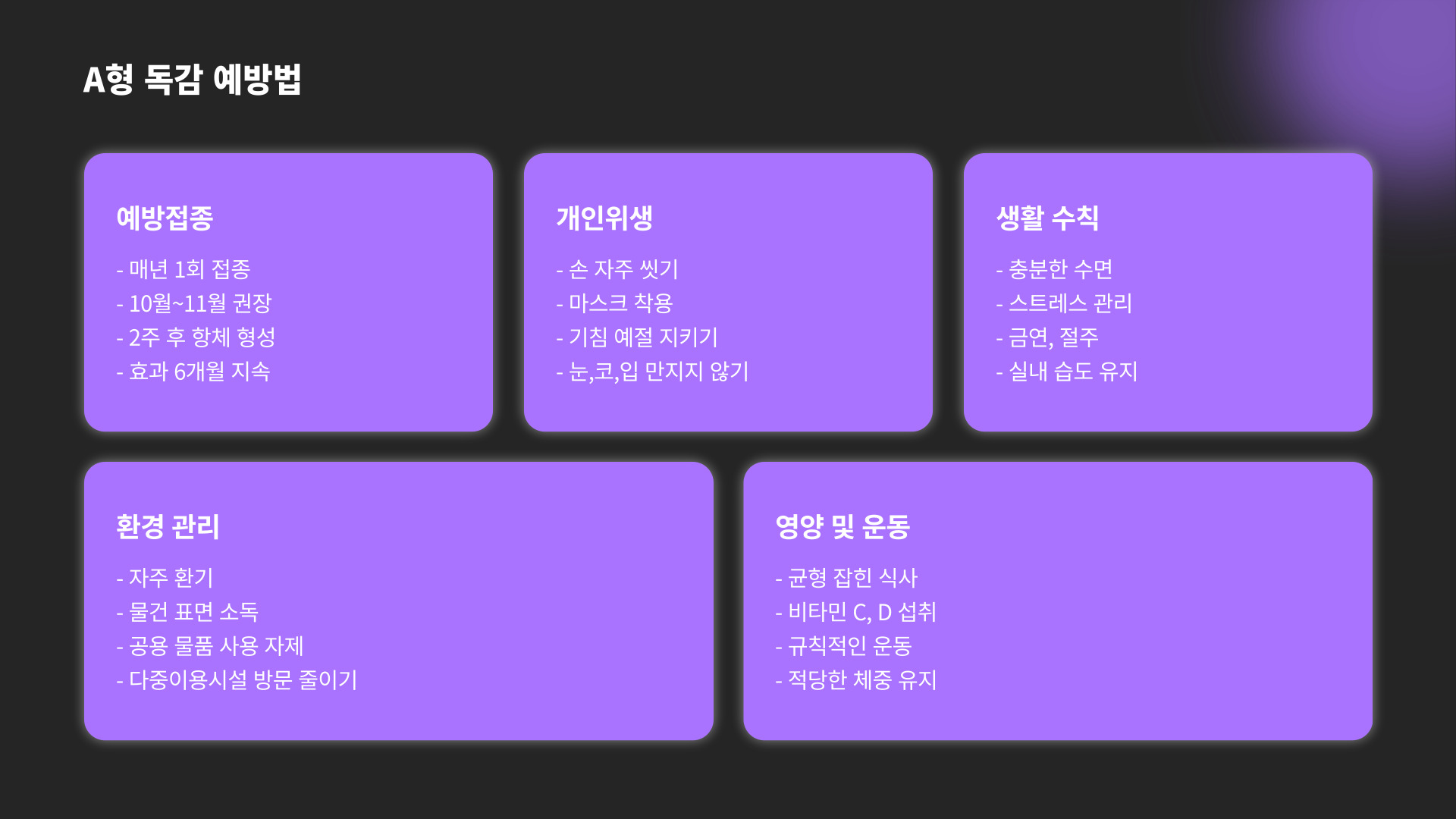 - 백신 접종, 개인 위생 관리, 건강한 생활습관이 예방에 중요하다.