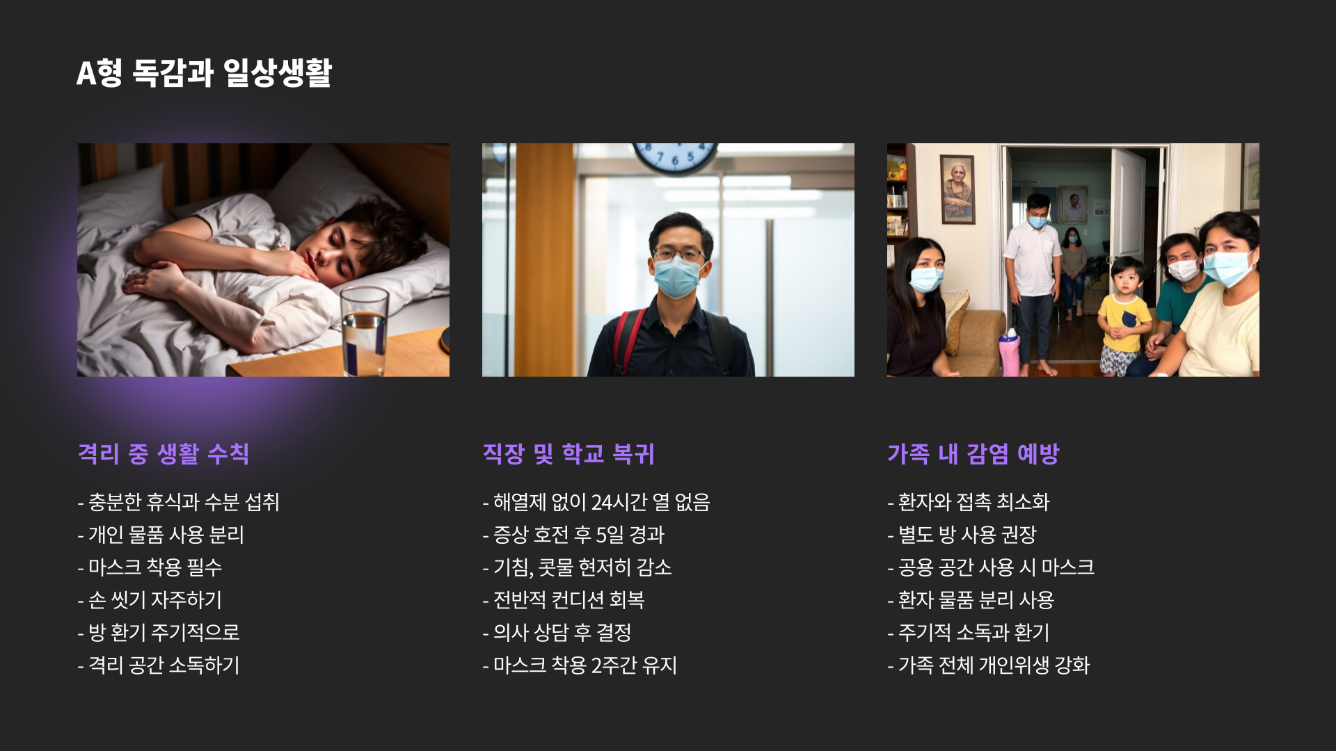 Tags: a형 독감, 격리기간, 전염성 질환, 예방 수칙, 건강 관리, 호흡기 질환, 면역력, 감염 예방, 생활 수칙, 독감 증상