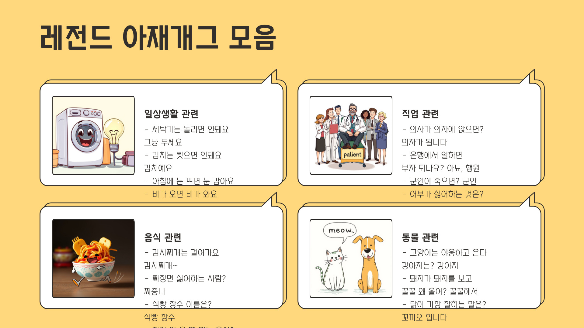 아재개그를 즐기기 위해서는 기본적으로 웃음을 유발하는 단어의 유희가 필요합니다. 예를 들어, "팔다리가 모두 불편한 사람은?"이라는 질문에 대한 답으로 "목발리안"이라고 답하면, 그 어이없는 발상이 웃음을 자아냅니다. 이러한 아재개그는 평범한 일상에서 쉽게 활용할 수 있는 유머의 대표적인 예입니다.