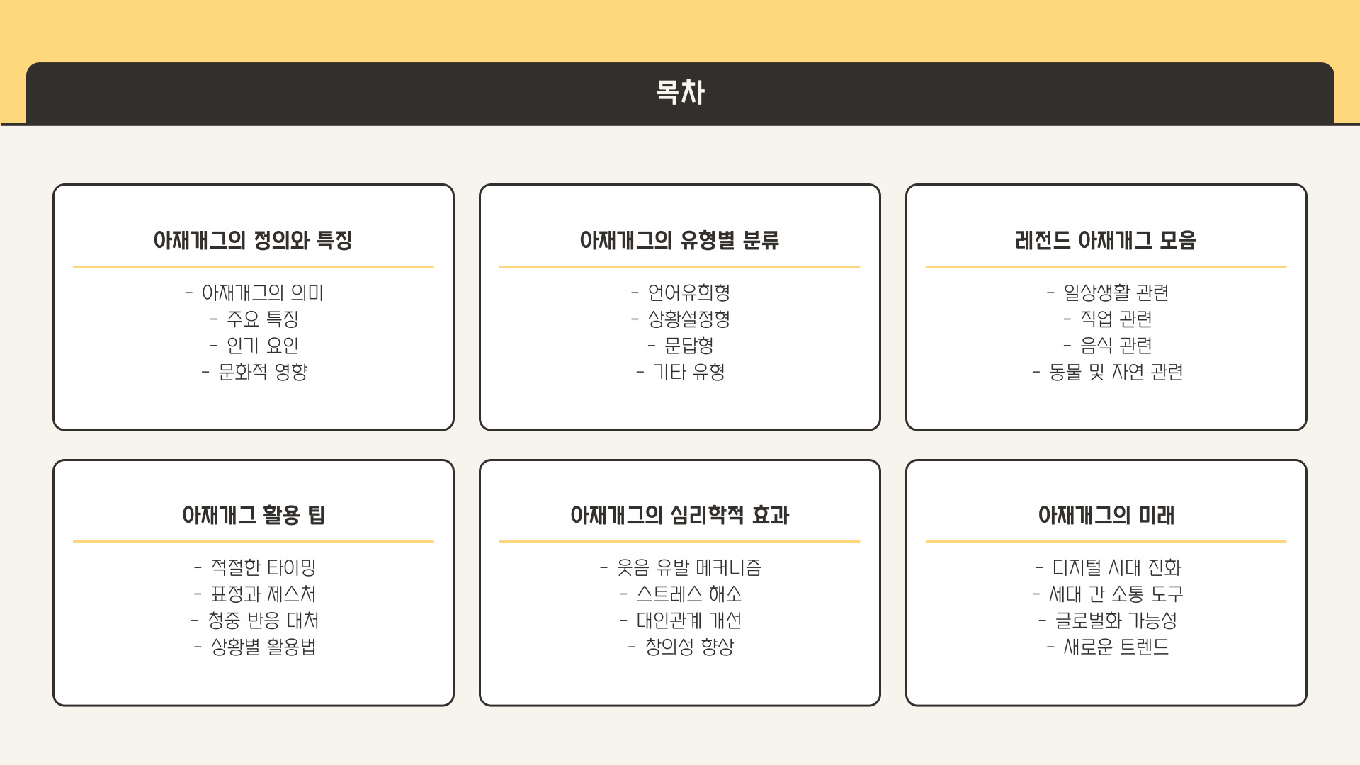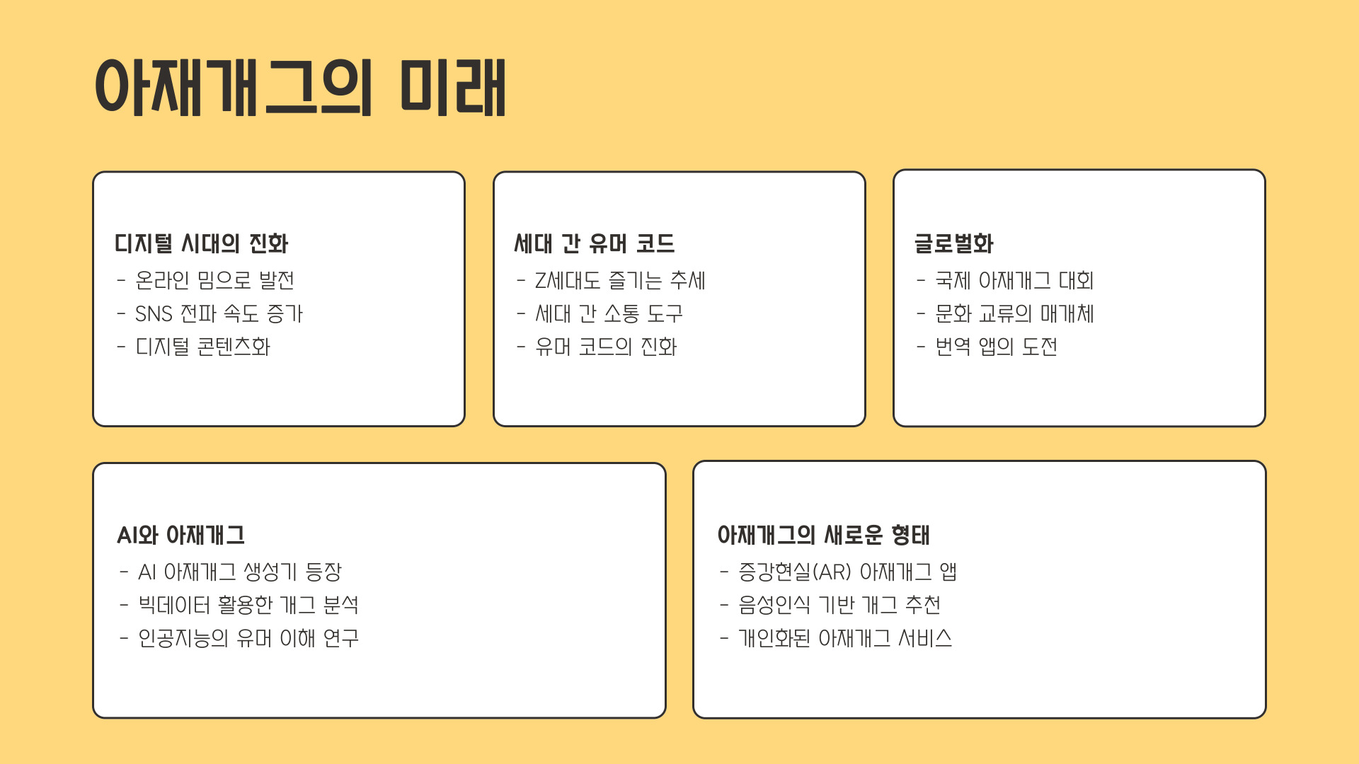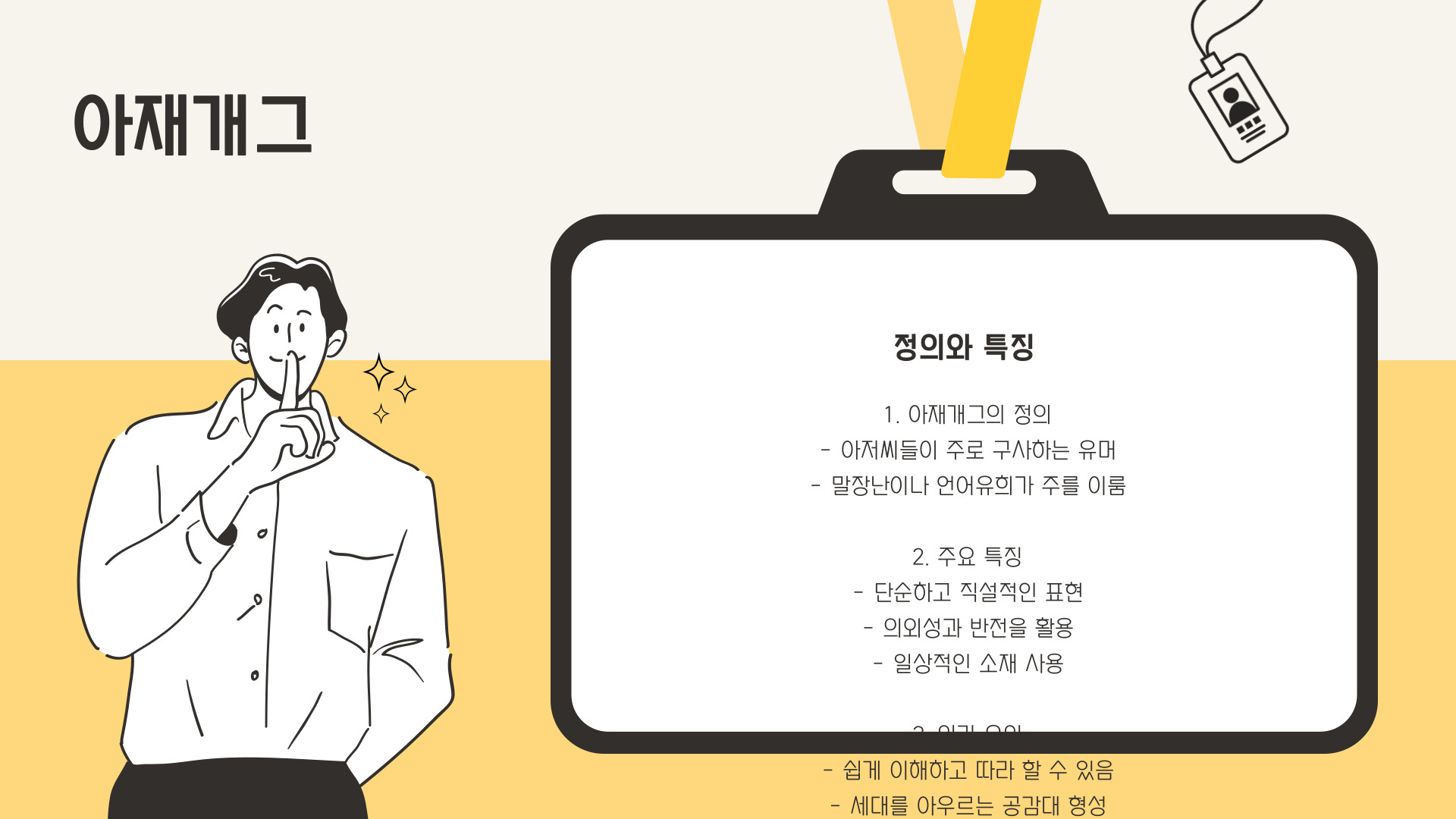 - 아재개그는 단순하고 허술한 유머로, 모두가 즐길 수 있는 특성이 있음