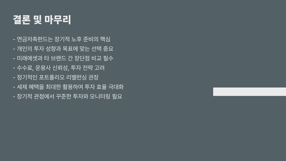 연금저축펀드는 노후를 준비하는 중요한 금융 상품입니다. 지금까지 다양한 옵션들이 있지만, 미래에셋과 다른 브랜드들의 장단점을 비교하는 것은 매우 중요합니다. 미래에셋은 특히 개인형 IRP와 관련하여 많은 이점을 제공하고 있습니다. 하지만 각 브랜드마다 제공하는 혜택과 기능이 다르기 때문에 신중한 선택이 필요합니다.