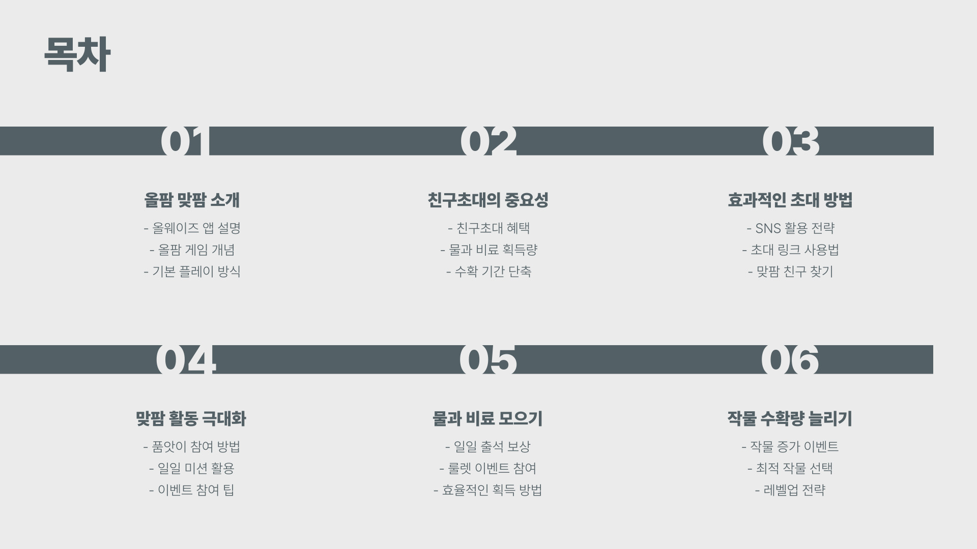 올팜 맞팜에서 친구를 초대하는 것은 게임을 즐기는 데 큰 도움이 됩니다. 친구 초대를 통해 얻는 다양한 보상은 게임 진행을 더욱 원활하게 만들고, 함께하는 즐거움을 더해줍니다. 위에서 소개한 방법과 전략을 잘 활용하여 친구를 초대하고, 3배 효과를 누리세요! 올팜 맞팜을 더 재미있게 즐기는 방법은 친구와 함께하는 것입니다.